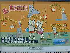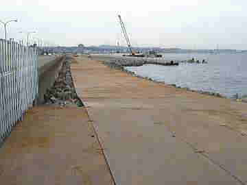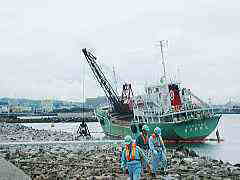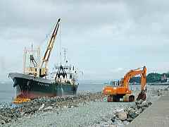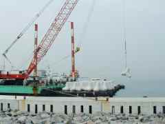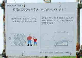 ![]() 海側に新しい波消しブロッ クが沈められる。 |
