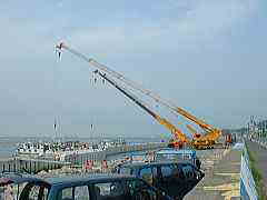 ![]() 地上から大型のクレーンが アシスト。クレーン車がよくも ひっくり返らないものと感心。 |