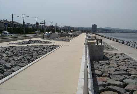 ![]() 大津側(海に向かって左側)は端までケーソンが設置された。 |