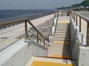 | 海側の手摺り部分 海水による腐食がもっとも気 になるところ。 詳しく材質は分からないが、鉄 製の本体がスチールワイヤで 結合されている。メンテナンス を考慮し各セクション毎に 交換が可能になっている。 |