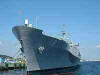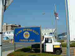 | 「横須賀」と言えば、沖縄と並んで「在日米軍基地の街」をまず思い浮かべる人も多いであろう。米海軍太平洋第7艦隊極東司令部が置かれており、空母「キティーホーク」の母港でもあり、折に触れて新聞紙上をにぎわしている。 もともとこの地は「横須賀海軍工廠」より常に海軍との関わりを持ってきた。戦前は旧日本海軍横須賀鎮守府があったこの地を、更に拡張して現在の米軍横須賀基地がある。現在の海上自衛隊の基地も目と鼻の先にあるが、通常、横須賀基地と言うと米軍基地をまず思い浮かべるくらいで、自衛隊の方はどちらかというと、ちょっと影が薄いか。 横須賀の住民は日常的には米軍横須賀基地を「ベース」と呼ぶ。無論通常は基地関係者以外は立ち入ることが出来ないが、フレンドシップデー、さくら祭り、みこしパレードなど、季節毎のイベントの時と、横須賀市が「横須賀国際交流協会」に委託して年に数回実施される「日米親善ベース歴史ツアー」等を利用して基地内の一部を見ることが出来る。(イベントにより公開される地域や内容が異なる。)今回(2003年9月28日)この歴史ツアーに参加したので基地の一部を写真で紹介したい。(正面ゲート近辺、潜水艦、修理中の艦船、6号ドックなどは撮影禁止であった。) |