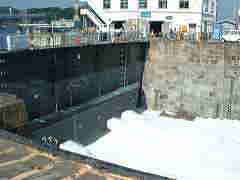 ![]() 運良く我々の目の前で海水の導水が始まった。翌日海上自衛隊の艦船が修理の ため入港するのだそうだ。 |
