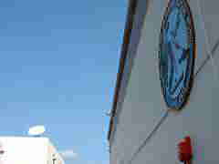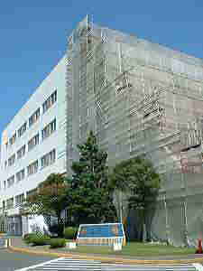 エンブレムコンピュータ通信施設の建物。旧日本海軍では将校クラブと して使われていたという。 戸塚にある衛星電波受信機経由で 極東地域の艦船や基地との通信を行う。 むろん、中の状況を知るすべもないが、心臓部とも言うべきコン ピュータ通信施設などは地下深く隠されているのかと想像して いたので、そのさりげなさがちょっと意外であった。 |