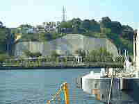 ドライドックから対岸に見える ヴェルニー公園 かつて臨海公園と言われていた 頃は、基地反対の集会デモが 頻繁に行われていた。 現在でも月一回の定例集会が あるようだ。 |